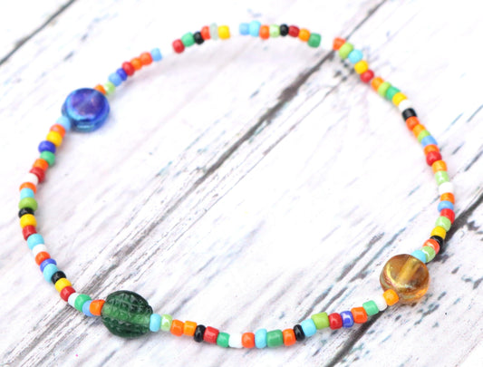 Yellow, Green, and Blue Artisan Glass Assorted Rainbow Seed Beads Bracelet