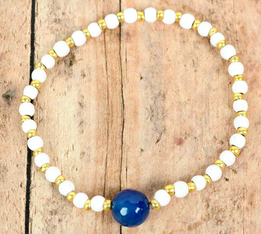 Dark Blue, Matte Rubber Hematite White Beads, and Yellow Gold Women's Glass Bracelet by Monkey's Mojo