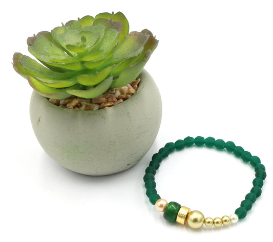 Into the Emerald Isle and Find A Pot of Gold - Dark Green and Yellow Gold Spring Glass Bead Stretch Bracelet