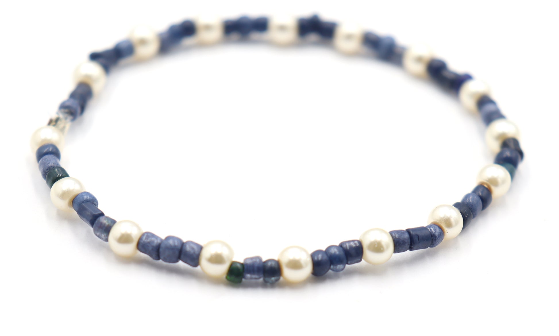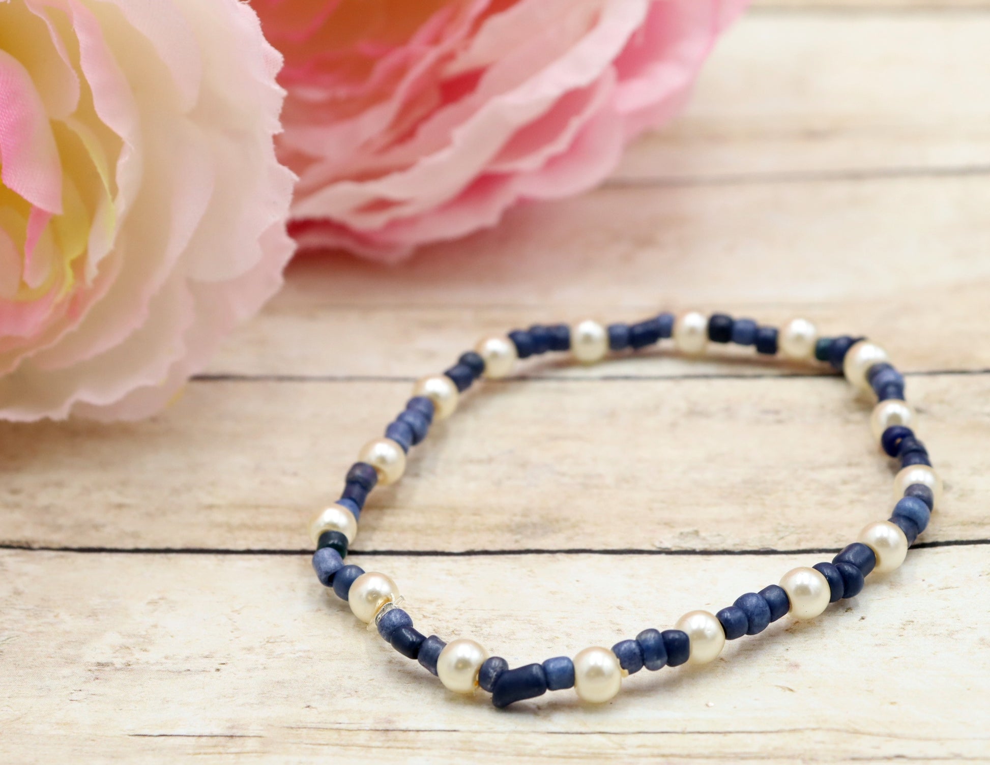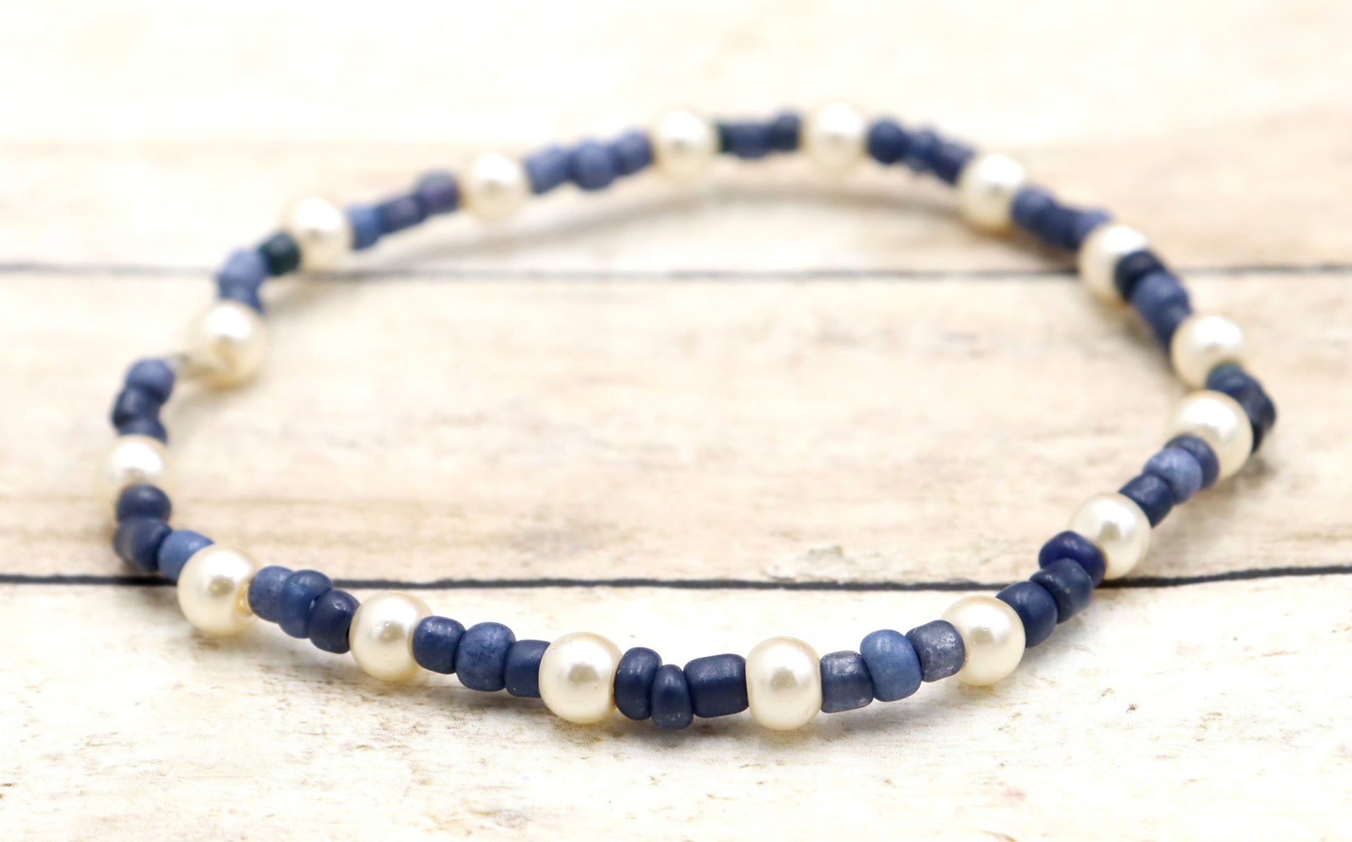 Classic and Classy Demin with Pearls - Blue and White Glass Bead Women's Stretch Bracelet by Monkey's Mojo
