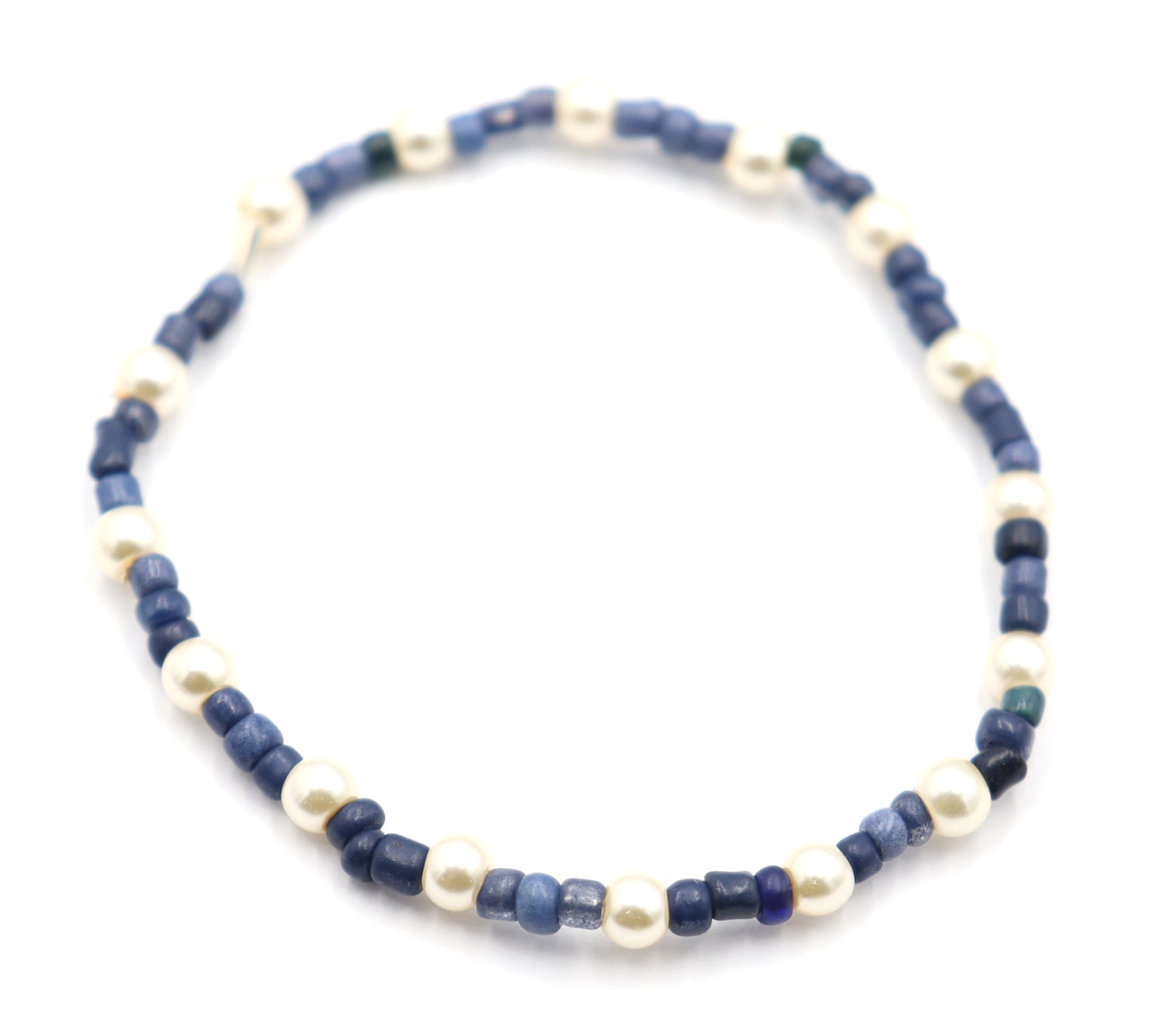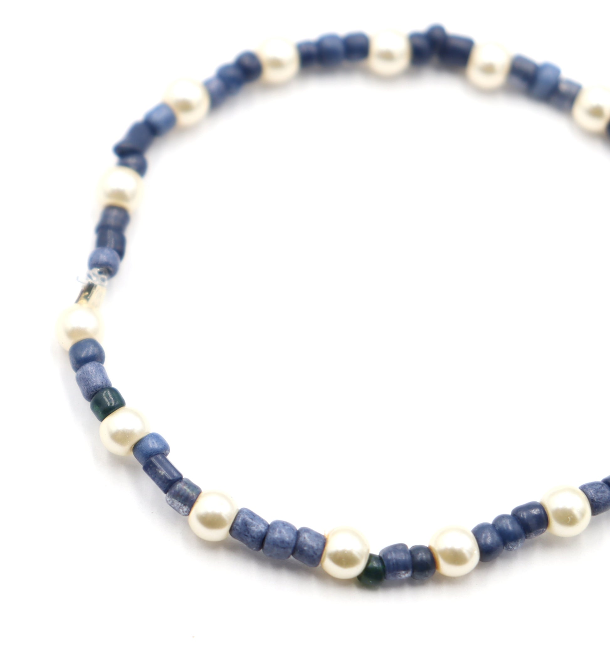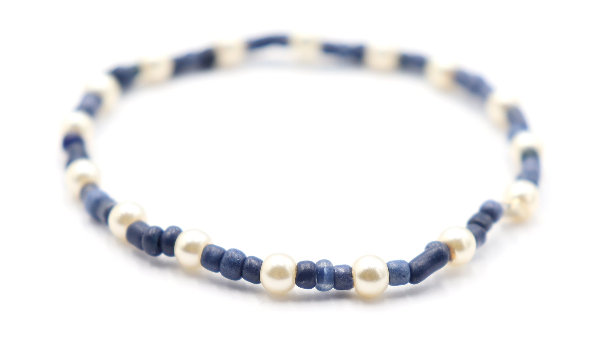 Classic and Classy Demin with Pearls - Blue and White Glass Bead Women's Stretch Bracelet by Monkey's Mojo