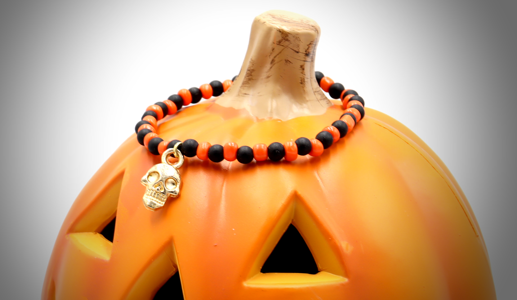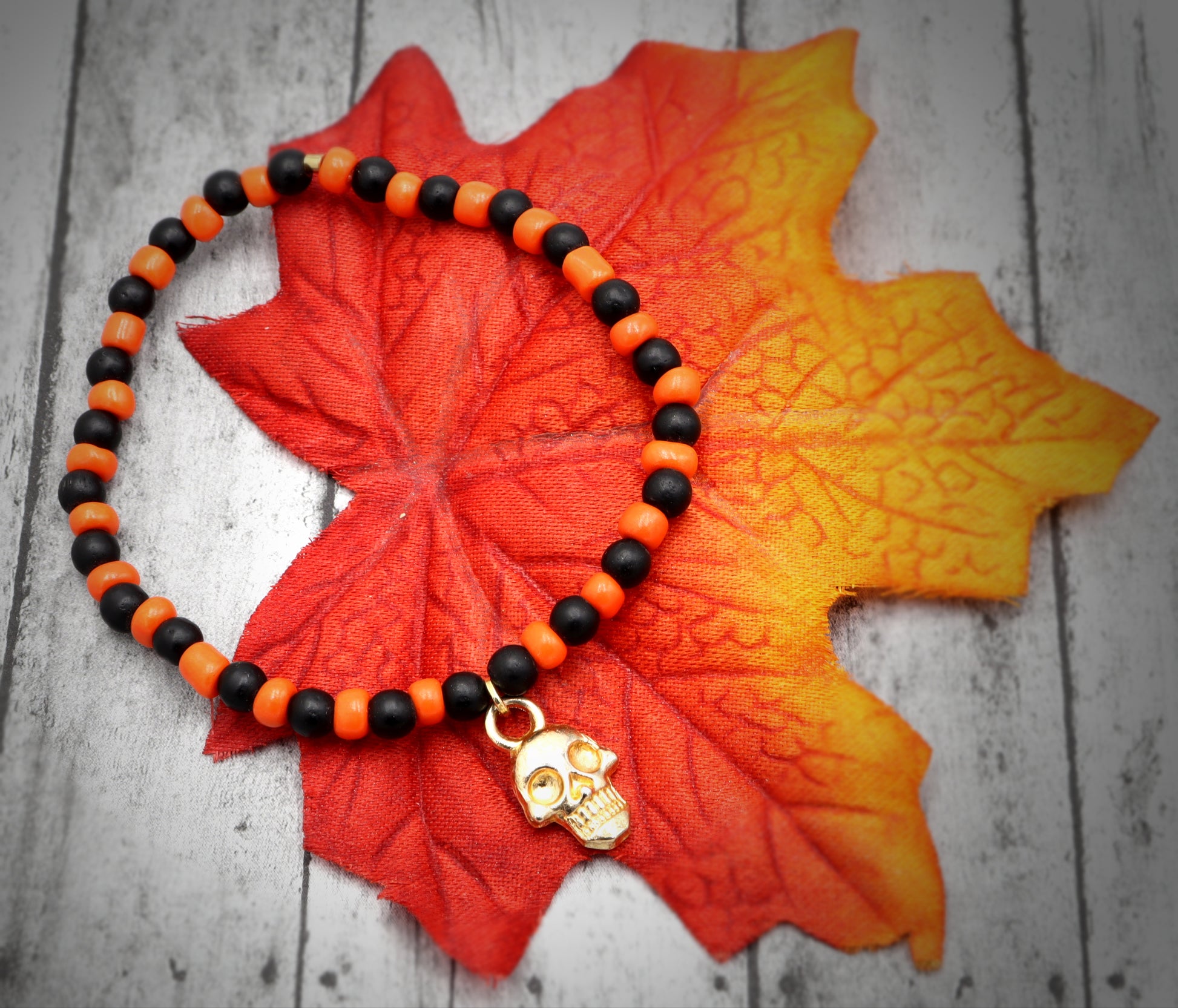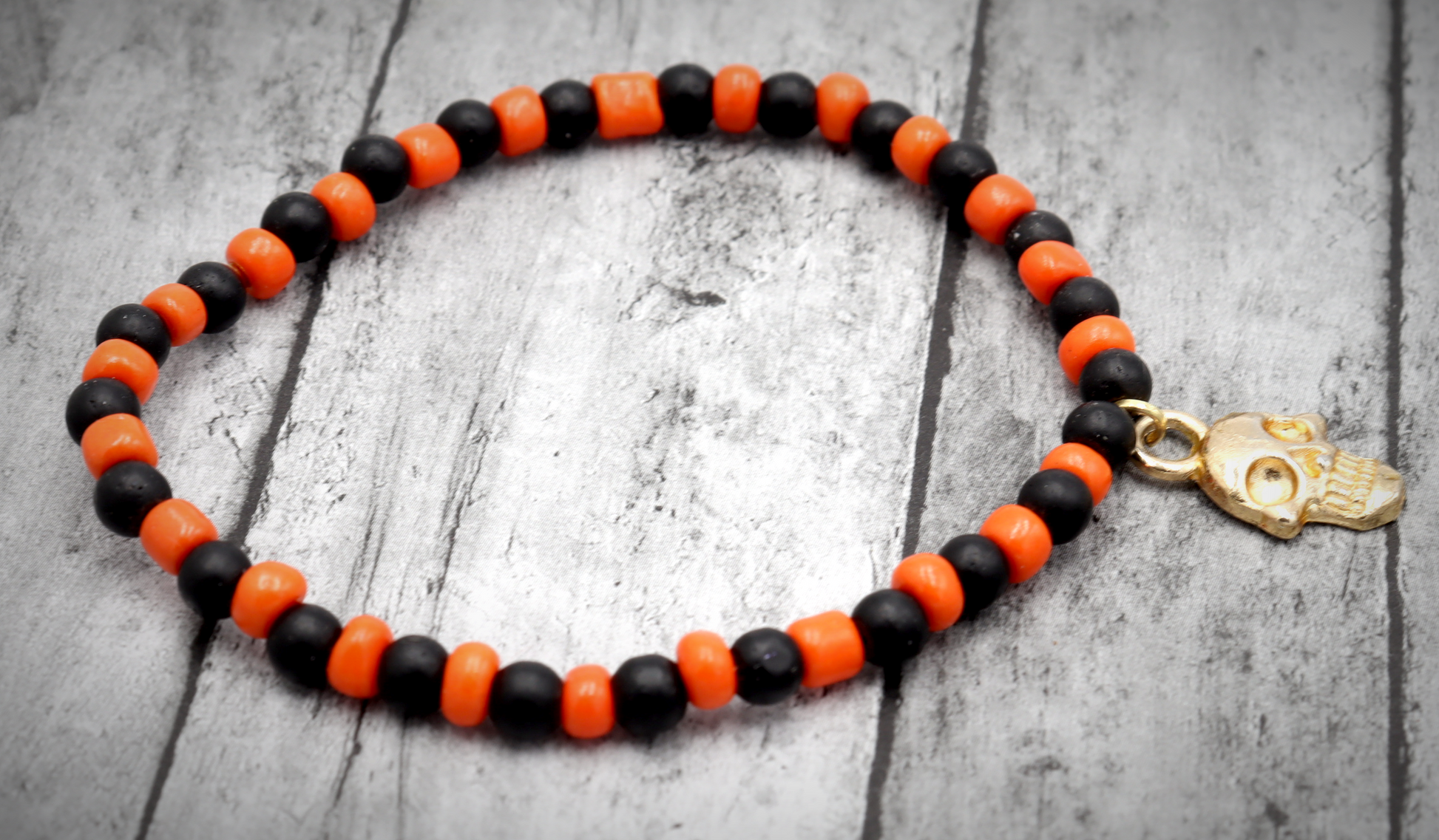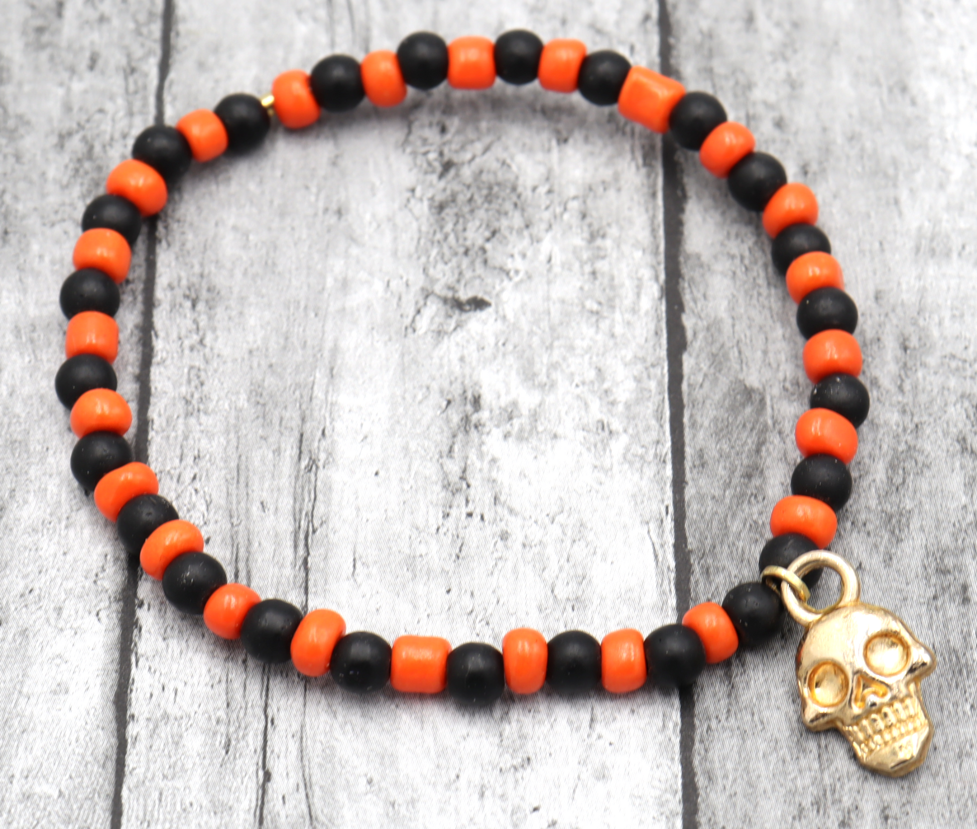 Classic Orange and Black Trick or Treat Yellow Gold Tone Skull Charm Halloween Stretch Bracelet by Monkey's Mojo