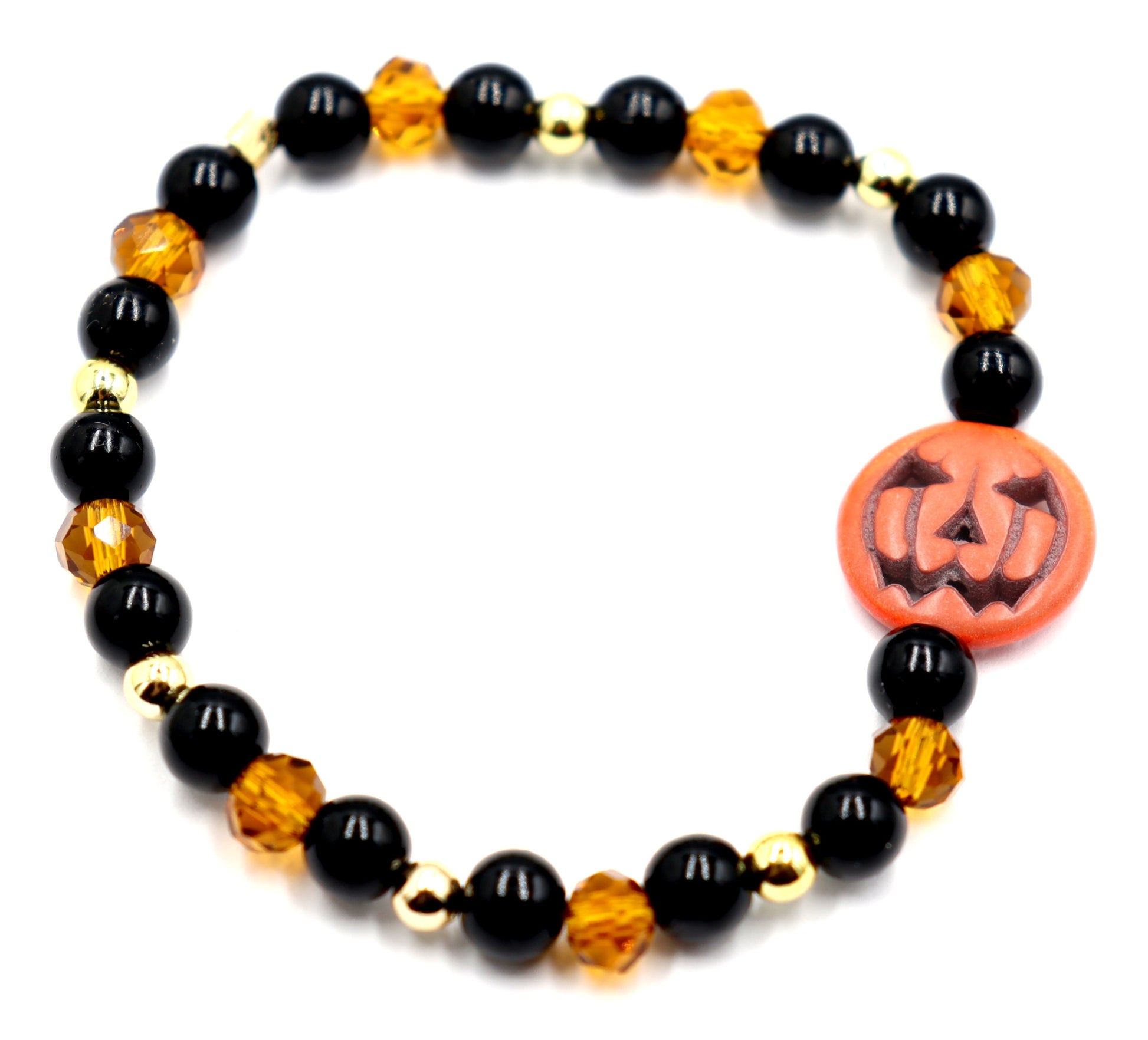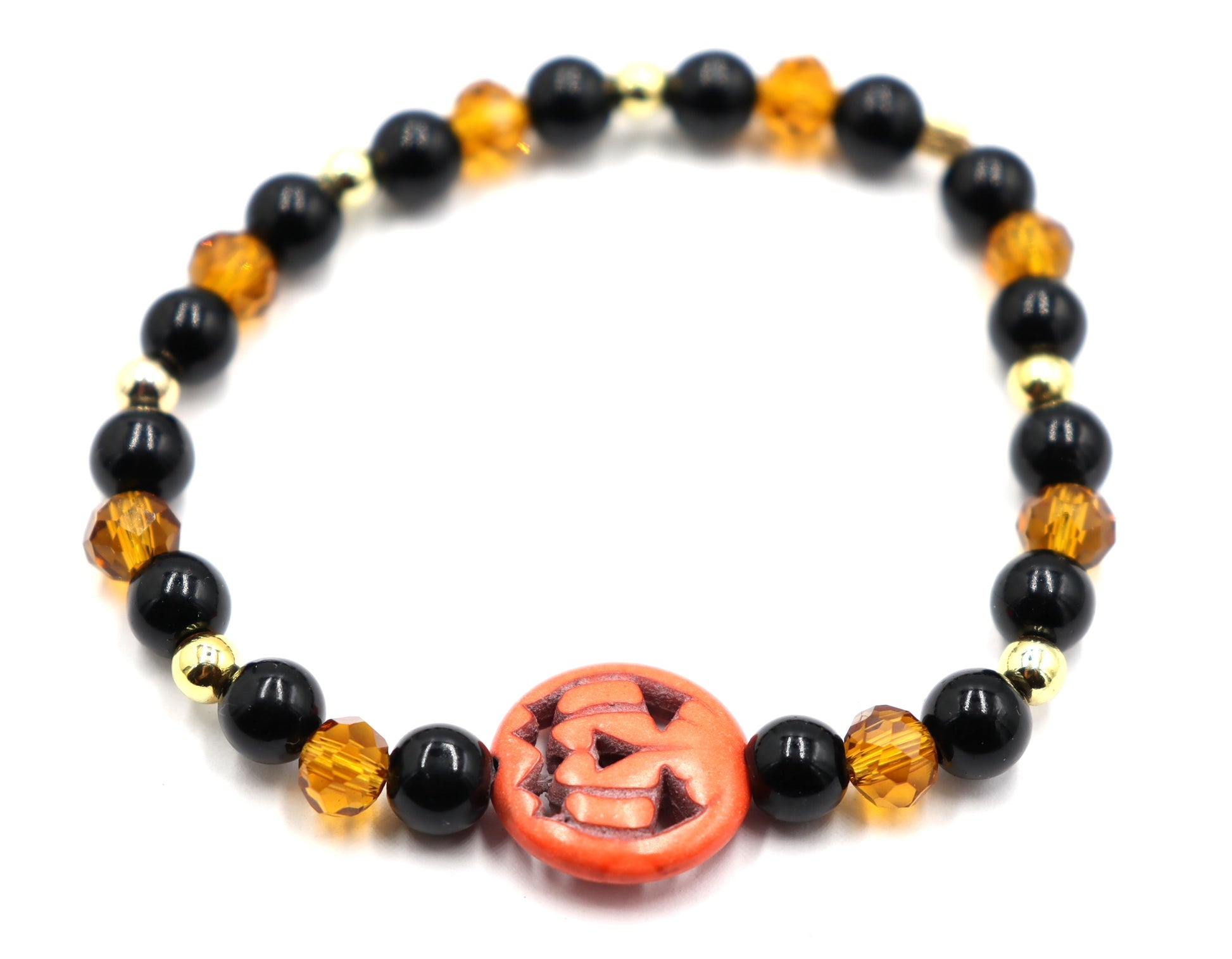 Pumpkin King Black and Gold Scream Halloween Themed Glass Bead Stretch Bracelet by Monkey's Mojo