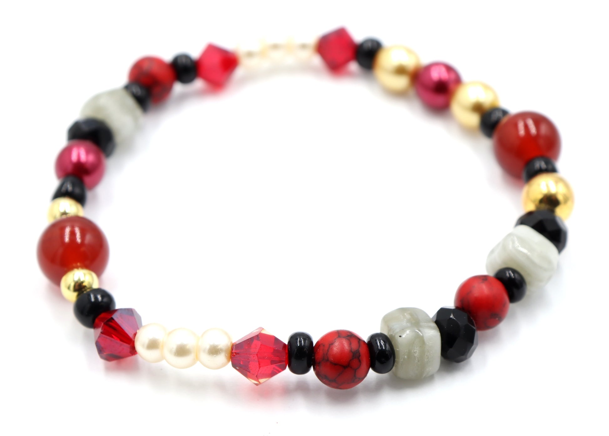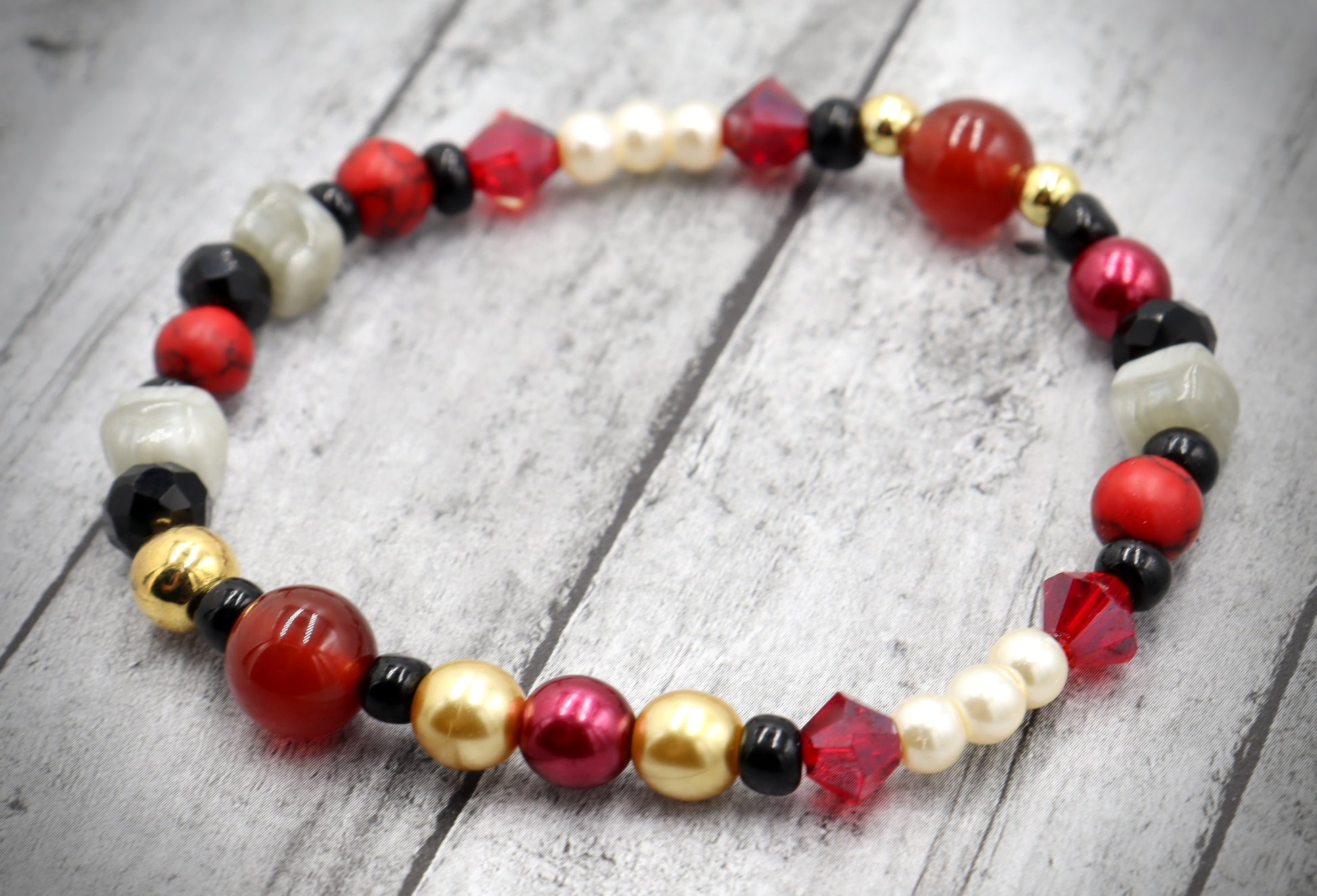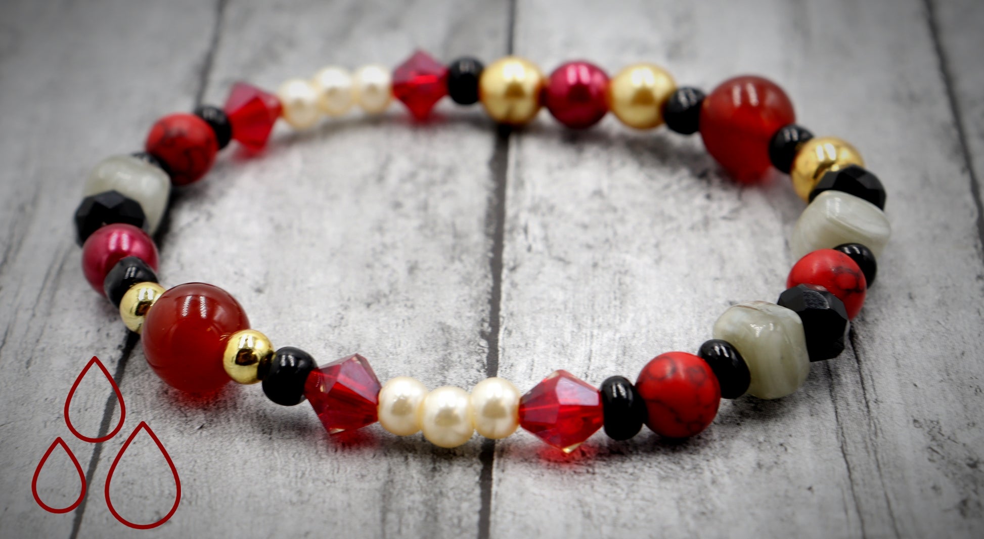 Better watch out this bracelet has some serious bite! Introducing Transylvania is Calling Home Vampire’s Bite Deconstructed Avant Garde Halloween Bracelet by Monkey’s Mojo. Black for this OG’s vampire fabulous cape. Red for the blood, the only thing to quench his eternal thirst. Gold for the king and first of all the vampires. White pearls for those shiny fangs. And Grey for the tombstone he never uses.