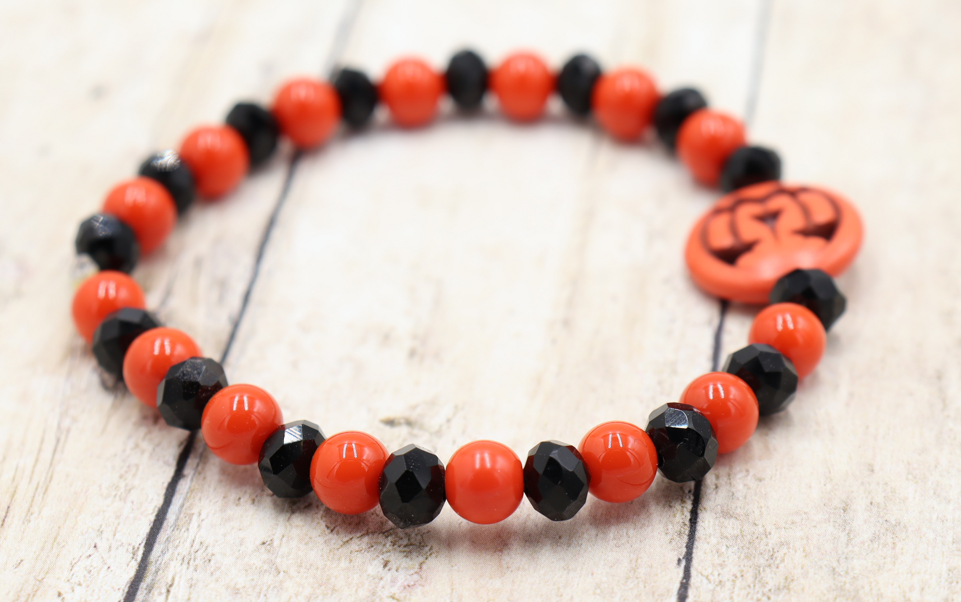 Tricking and Treating Classic Orange and Black Craved Pumpkin Glass Bead Stretch Bracelet by Monkey's Mojo