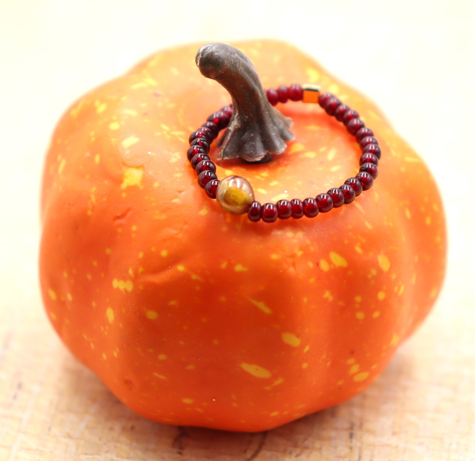 Garnet red is a rich bloody red color combined with the iridescent glow of this golden round artisan bead? It's like a vampire and the Grim Brother's Princess and the Grong all rolled into one. Can you get more Halloween then that? Ring shown is a size 6 but can be sized from 5 to 10. Just let us know at checkout what size you would like the ring.